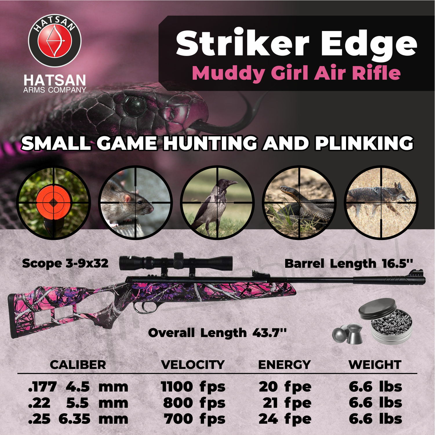 The Edge Spring Muddy Girl Combo Air Rifle with a Muddy Girl Camo Advanced Polymer Stock. Hatsan air rifles have gained a reputation for delivering exactly what the manufacturer promised. Whether you hunt or just like to plink-the Hatsan Edge will perform well. Large muzzle brake for easy cocking, with hooded TruGlo fiber optic front sight Includes 3-9x32 Optima scope and mount.