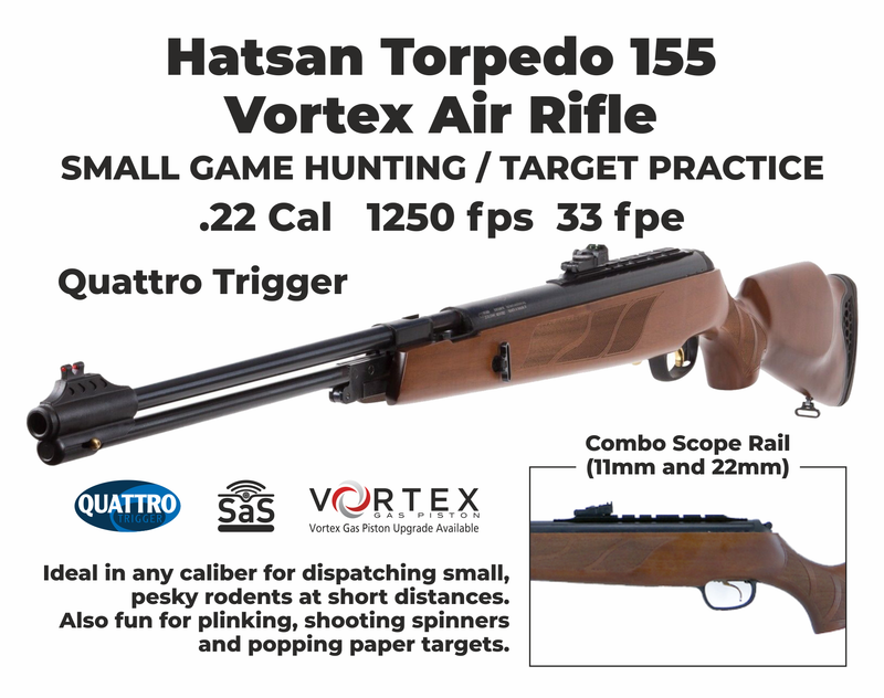 - The beautiful Turkish walnut stock will be the first thing that gets you. Then, you'll notice the highly adjustable trigger and the lack of vibration due to the unique shock absorber system. Get the Hatsan Torpedo 155 airgun if you'd like to hunt, eliminate small garden pests, shoot spinners, pop some paper targets or just plink. It can do all of it!