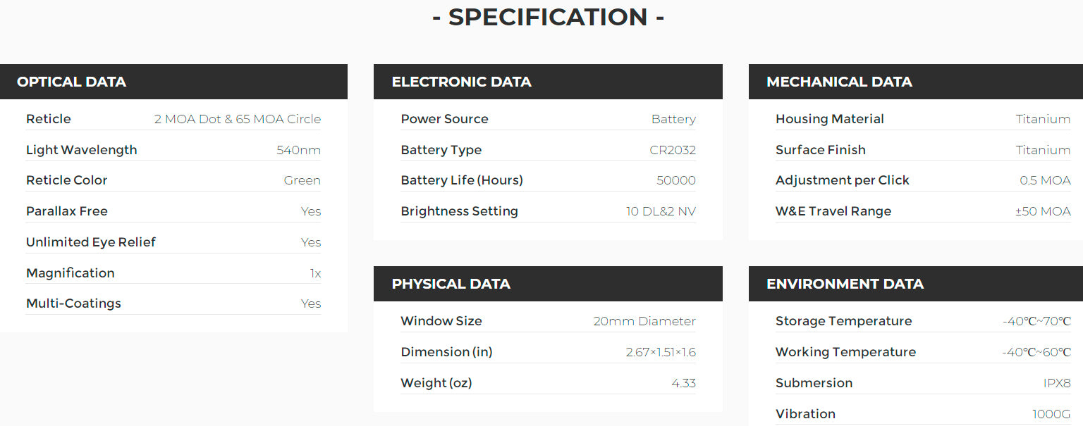 - Reticle: 2 MOA Dot & 65 MOA Circle
