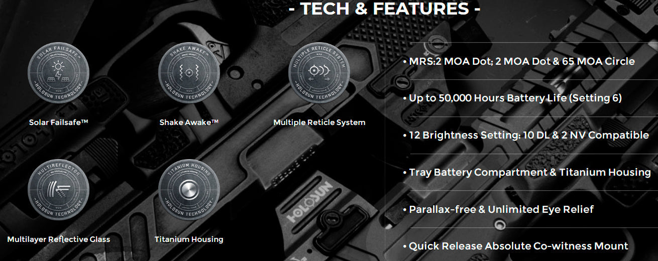 Our highly efficient light emitting diodes and Solar Fail-safe technology allow the 530C optics to run without a battery in many lighting conditions. Holosuns Shake Awake technology puts the optic to sleep with no motion and wakes it up, recalling the last setting with the slightest movement, conserving battery life even further.