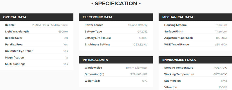 - Reticle: 2 MOA Dot & 65 MOA Circle