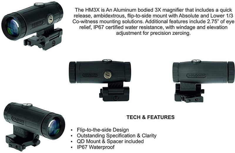 is An Aluminum bodied 3X magnifier that includes a quick release, ambidextrous, flip-to-side mount with Absolute and Lower 1/3 Co-witness mounting solutions. Additional features include 2.75” of eye relief, IP67 certified water resistance, with windage and elevation adjustment for precision zeroing.