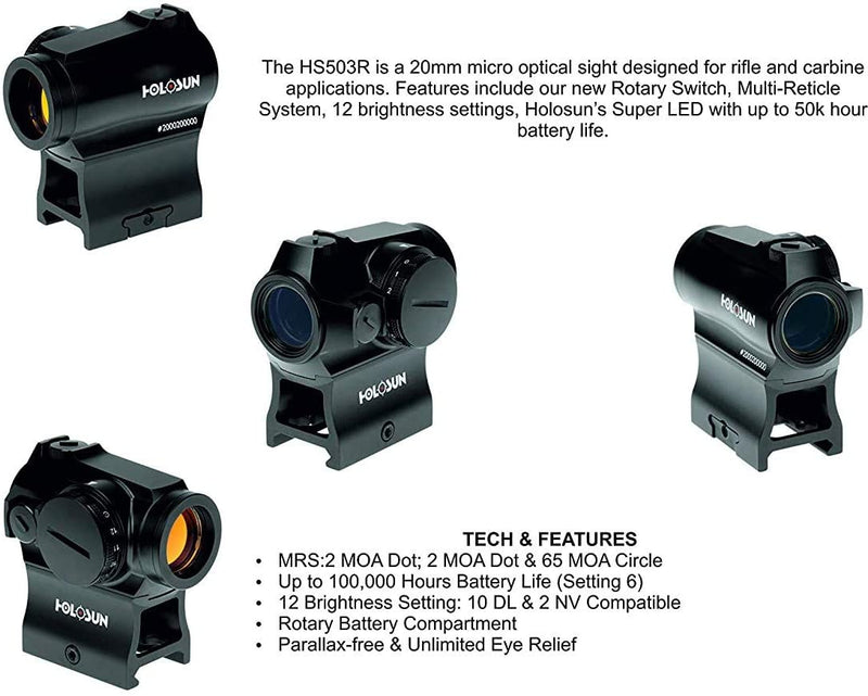 Get adjustable brightness, unlimited eye relief, unlimited field of view and tons of other helpful features to enhance your precision and quickness in the field with the Holosun HS503R 1x Red Dot Sight. Holosun built these Red Dot Sights with their proprietary advanced LED technology that provides up to 100,000 hours of operation using only one CR2032 battery. Also, this Holosun HS503R Adjustable Red Dot Sight offers 10 brightness settings for daylight and 2 options that are night vision-compatible so that you can customize your viewing experience to best suit your current needs. These optics also offer the Multiple Reticle System that lets you select a 2MOA dot or 65MOA ring to acquire targets. Feel free to use these in any environment or weather conditions since they're contained in a durable aluminum housing and are shockproof, waterproof and fogproof.