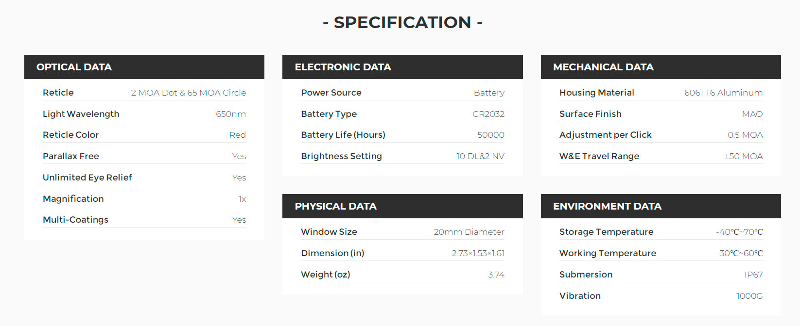 - Reticle 2 MOA Dot & 65 MOA Circle