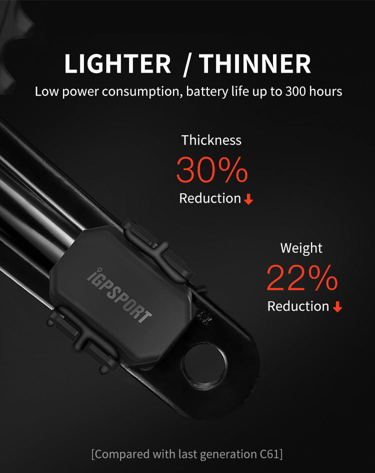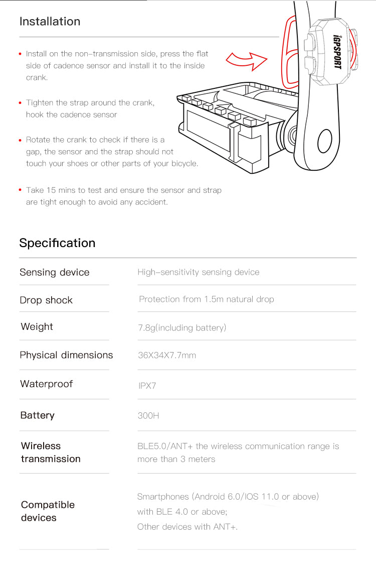 Better cadence sensor, better cycling experience, CAD70 cadence sensor helps you find the optimal cadence, making riding easier and training more efficient. Battery life is up to 300 hours, IPX7 waterproof passed, Bluetooth and ANT+, compatible with major brands of computer and mobile phones.