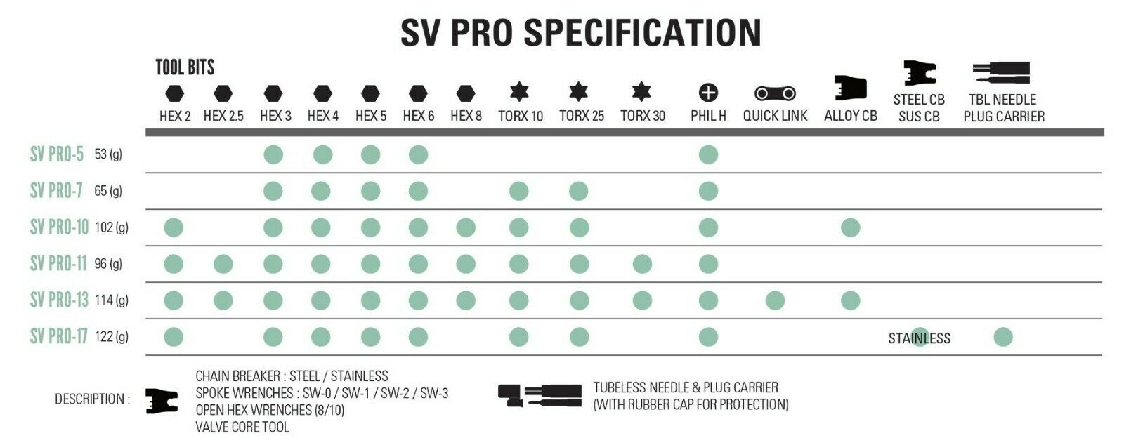 The SV Pro stainless steel bike multi tool series represents the pinnacle of multi tool design and technology. Developed and manufactured in-house, these tools feature the best materials and they have been specifically engineered for easy road and trailside repairs. Each tool bit is meticulously machined from high-grade stainless steel, and crafted to be as compact and lightweight as possible. The side plates are shaped from machined aluminum creating an ergonomic feel and distinct styling. The SV Pro Series offers a variety of models for any mountain biker or road cyclist looking for the ultimate, corrosion-free mini tool.