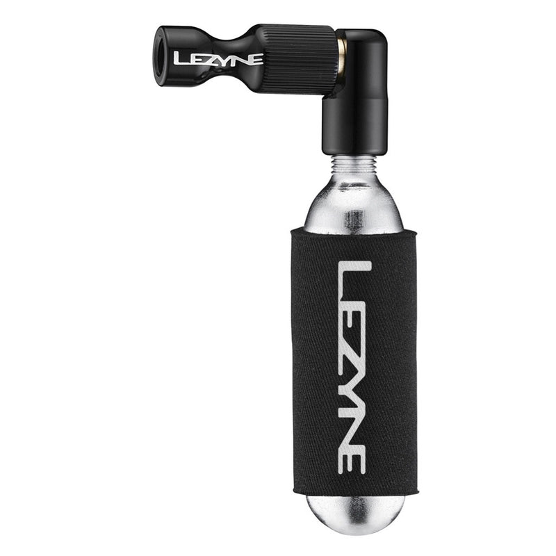 CNC machined aluminum dispenser with brass internals. Trigger Valve Operation for easy and controlled inflation. Twin Chuck head threads on to Presta and Schrader valves. Neoprene sleeve insulates hand from cold during discharge. Compatible with threaded CO2 cartridges, comes with one 16g cartridge.