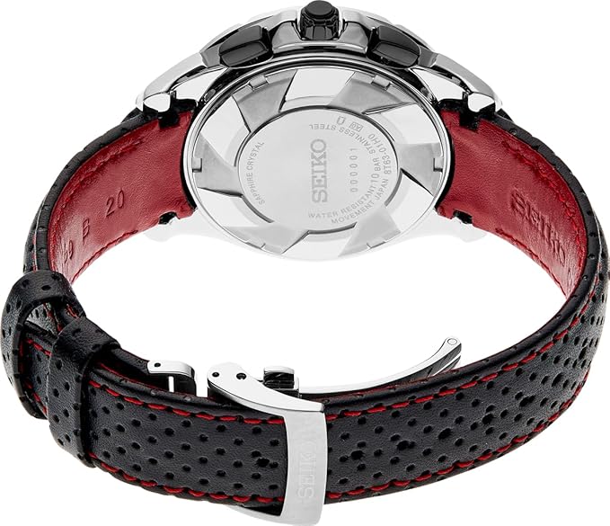 - Black perforated leather strap with red contrast stitching suggesting vintage driving gloves