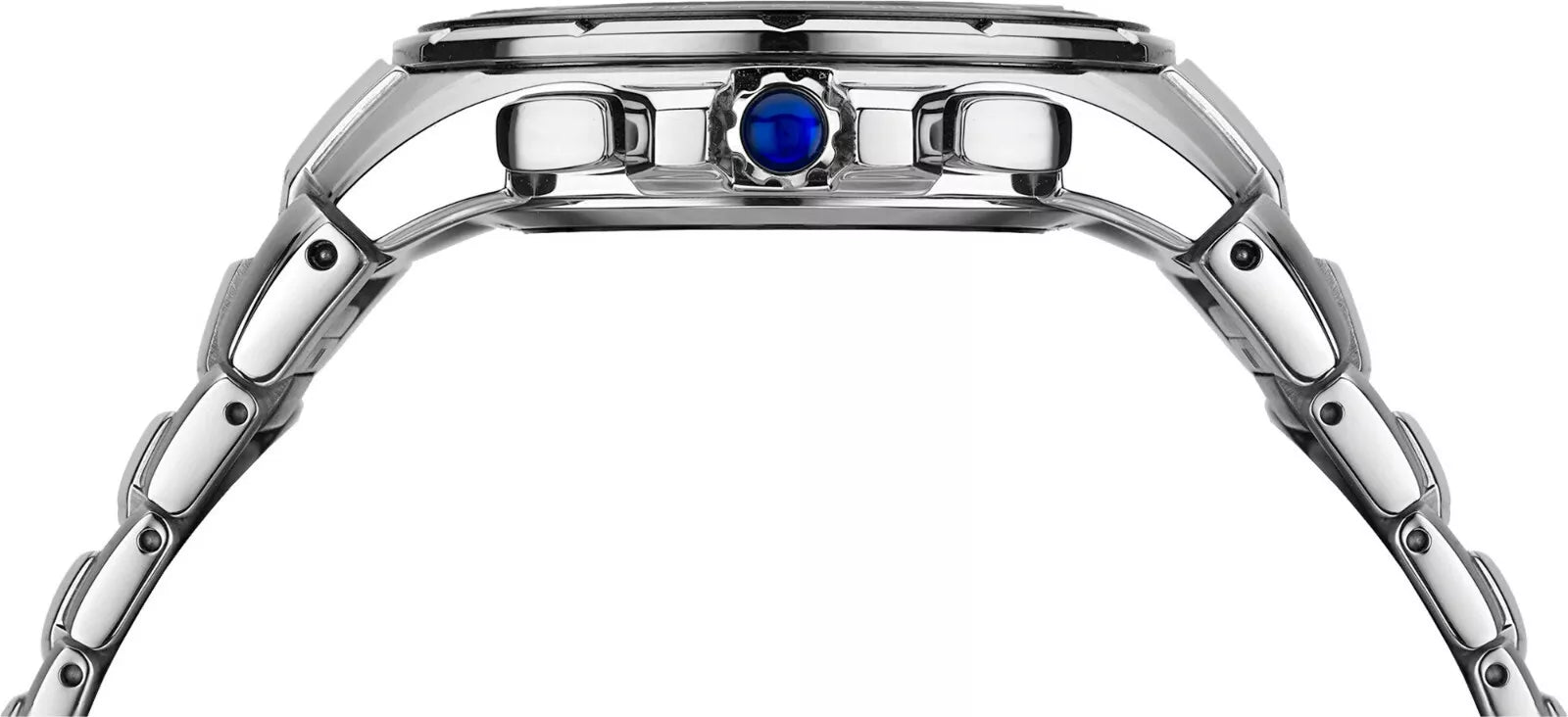 Seiko Coutura Radio Sync Solar Chronograph. This bold men’s watch is designed with a stainless steel case and bracelet and a cabochon crown. The bold black dial features lumiBrite hands and markers, a date calendar and three subdials with blue highlights. The gray bezel includes a world time function featuring 25 time zones. Radio-controlled, Radio Sync Solar Chronograph automatically receives radio signals to precisely adjust the time and calendar signal reception and result indicator. The chronograph measures up to 60 minutes in 1/5 second increments with a split time measurement function and a date calendar. Powered by any light energy, its Solar Cell is energy-efficient with a 6-month power reserve once fully charged. No battery change is required. 100M Water Resistant