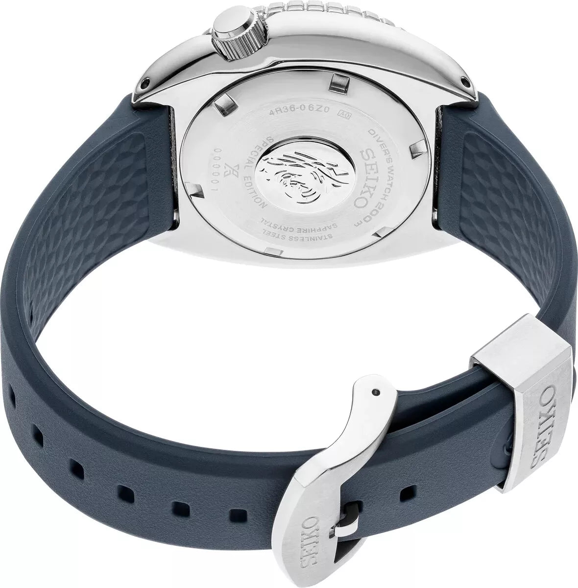 Prospex Special Edition “Manta Ray” Diver. Designed for those who treat life as the ultimate adventure, the Seiko Prospex line meets every challenge with technological excellence and winning design. Inspired by Seiko’s most iconic diving styles, this distinctive Special Edition evokes the world view of a manta ray with the rich, dark gradated blue of the dial suggesting the variations in sunlight as it penetrates deep into the ocean, heightened by a stamped pattern suggesting waves. For reliable timing in rough waters, the 24-jewel automatic movement beats at a frequency of 21,600 vibrations per hour, with a power reserve of approximately 41 hours, and can be wound manually or automatically. Featuring a magnified day/date calendar and LumiBrite hands and markers, the dial is framed by a black ceramic uni-directional rotating elapsed timing bezel. In stainless steel, with secure screwdown crown and caseback, anti-reflective sapphire crystal and deep blue silicone strap, this high-intensity timepiece follows ISO standards for scuba diving. 200m Water Resistant