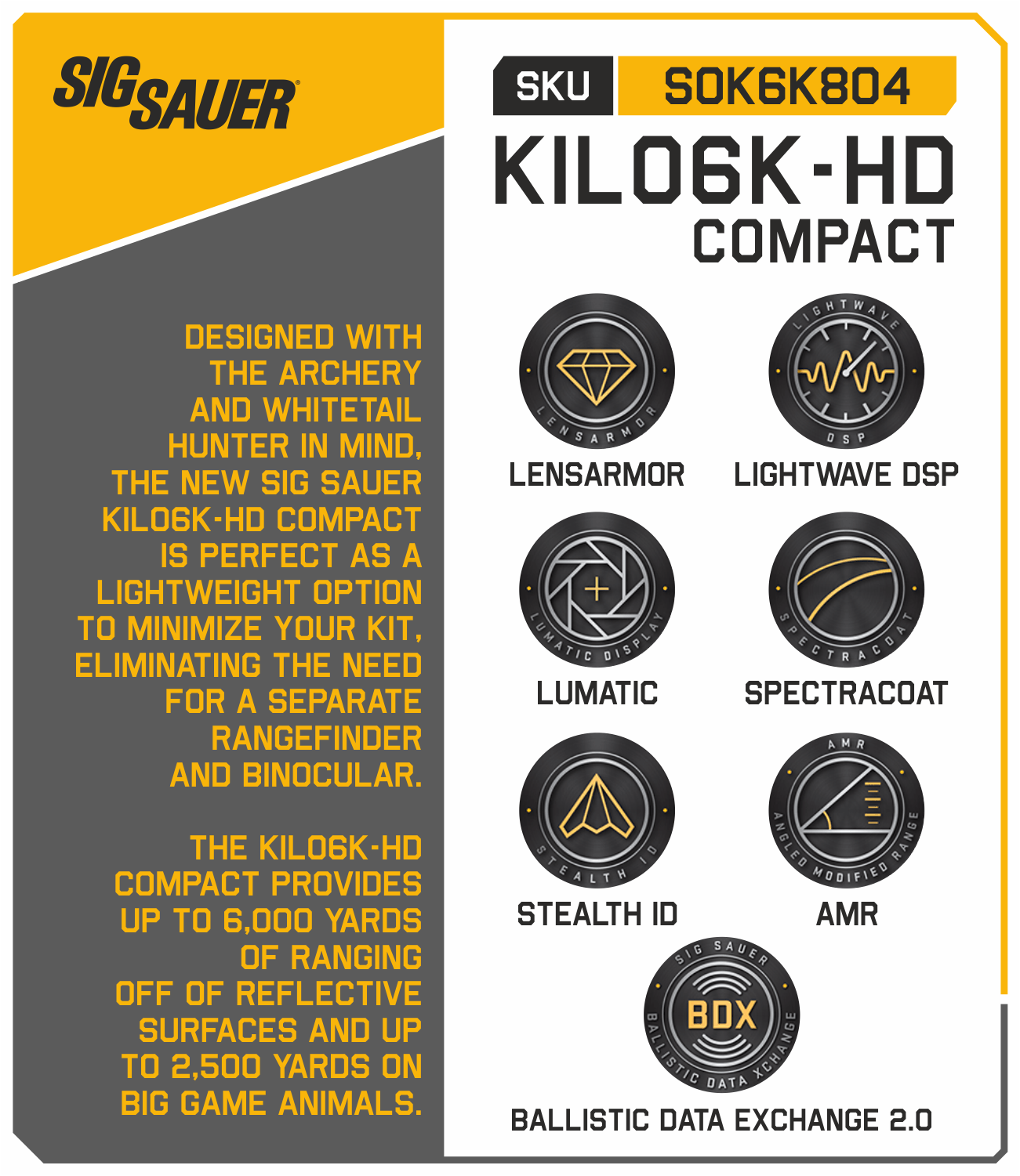 The new SIG SAUER KILO6K-HD Compact is perfect as a lightweight option to minimize your kit, eliminating the need for a separate rangefinder and binocular. The KILO6K-HD Compact provides up to 6,000 yards of ranging off of reflective surfaces and up to 2,500 yards on big game animals. Featuring BDX 2.0 Bluetooth Technology to work with all BDX-equipped scopes and thermal optics, and onboard environmental sensors allowing for accurate real-time ballistic calculations, the KILO6K-HD Compact provides the perfect solution. The KILO6K-HD Compact also features fog mode to cut through the morning haze and Extended Range mode to allow for longer range capabilities from a tripod, giving you maximum range both quickly and accurately. The KILO6K-HD Compact is the ideal solution for the minimalist hunter.