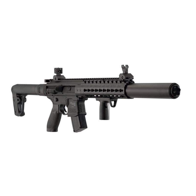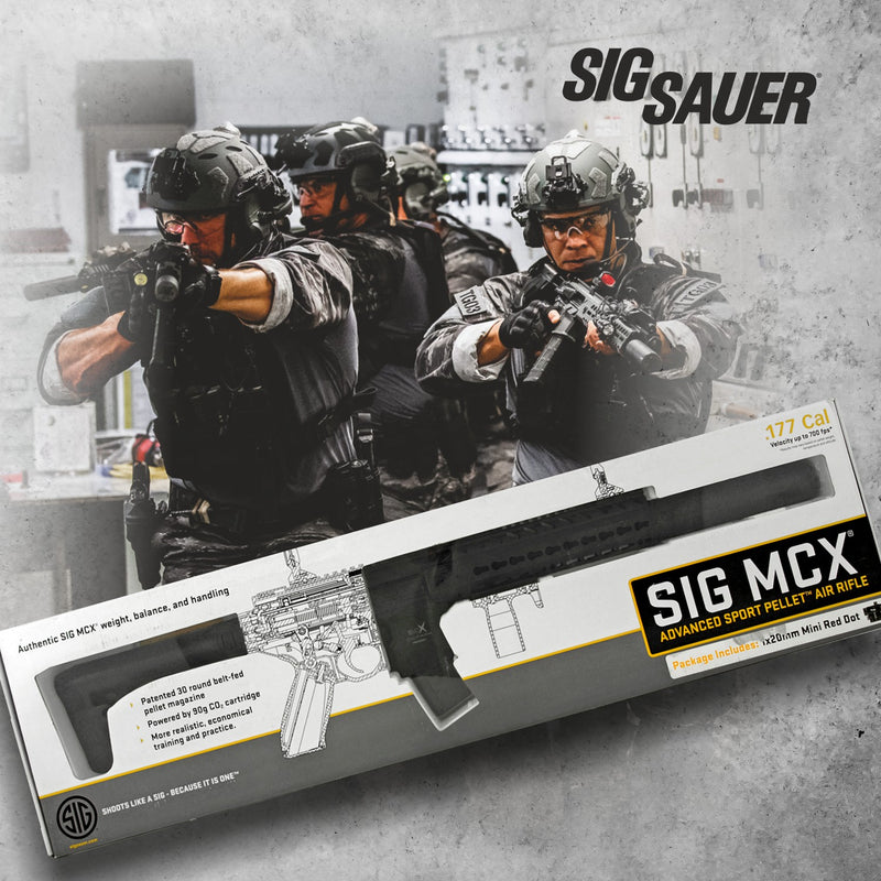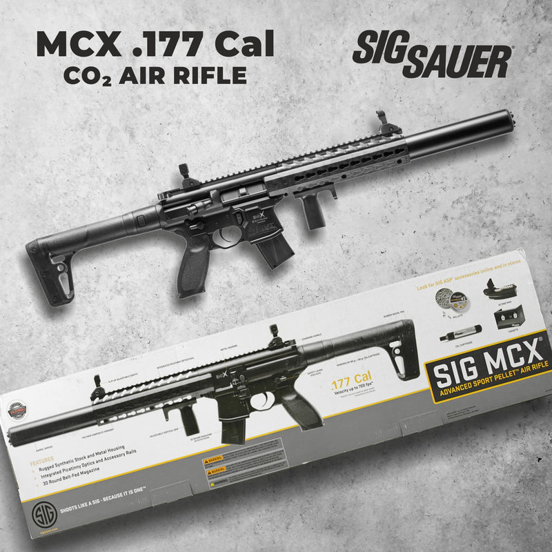 The Sig Sauer MCX Air rifle uses a 90-gram CO2 cartridge. This semi-automatic air rifle is perfect for target practice or plinking fun! It has a 30 round mag, manual safety. The durable metal housing and aluminum handguard sports a picatinny accessory rail for your favorite optics. It features authentic MCX performance and handling giving you more realistic training and practice in an economical platform! Chambered in .177 pellet, features include an 18" rifled steel barrel, synthetic handguard, picatinny rail, tactical front grip, flip-up front and rear sights and more.