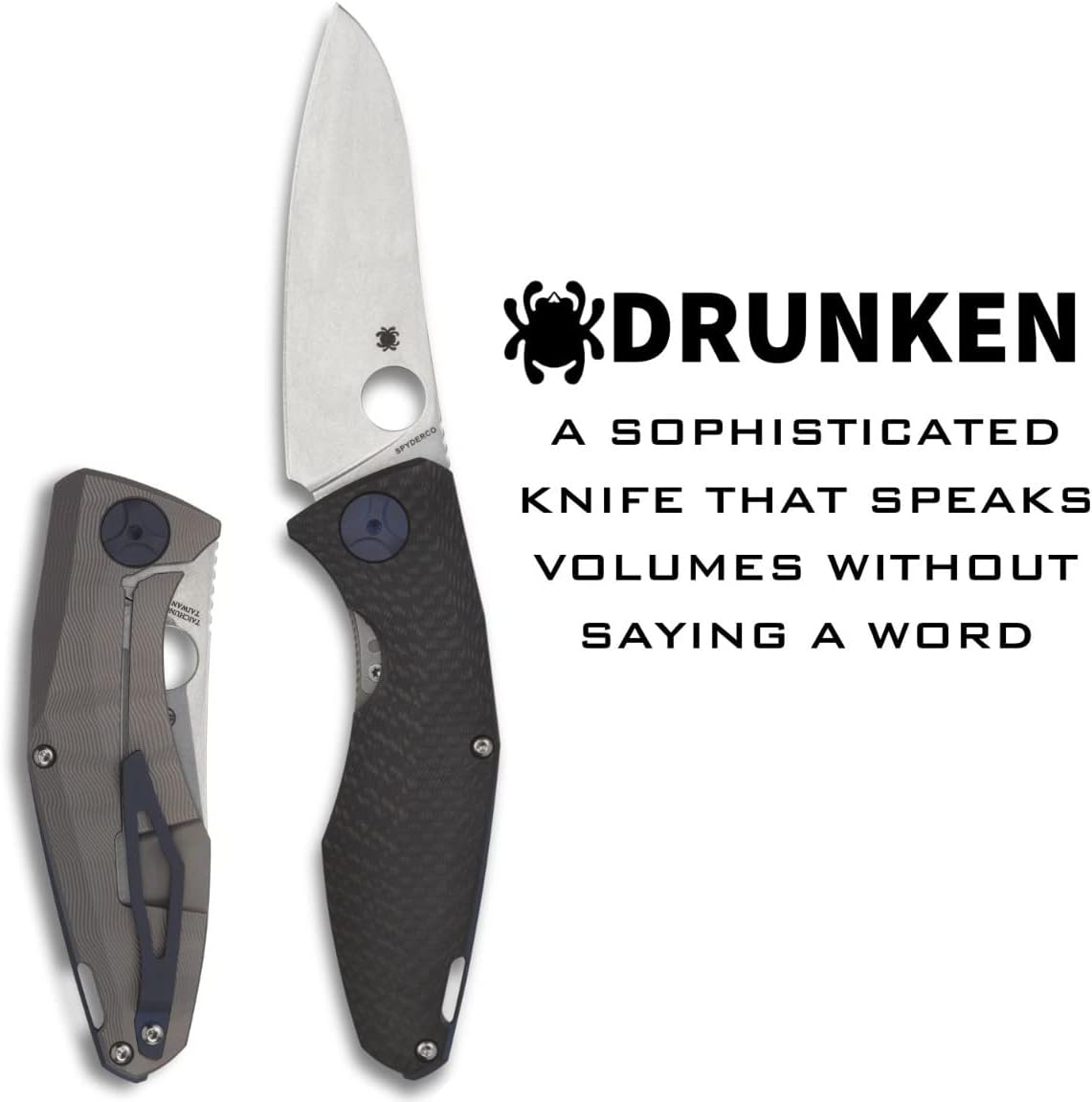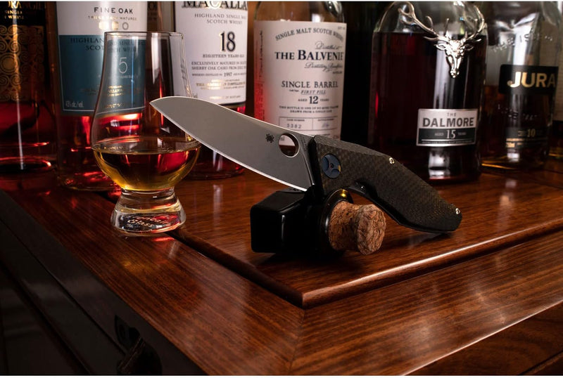 Dmitry Sinkevich is one of the hottest custom makers in the knife industry today. His first Spyderco collaboration, the Drunken, showcases his ability to combine artistic design and unparalleled craftsmanship with practical function. The blade of this knife is full-flat ground from CPM S90V stainless steel and features a tumbled finish. It is paired with a stylishly ergonomic handle that includes a titanium scale on one side and a solid carbon fiber scale and nested stainless steel liner on the other. The titanium scale is “webbed” to reduce weight and forms the basis for the knife’s Reeve Integral Lock mechanism, which includes a long-wearing stainless steel interface. Both scales are meticulously machined with the intricate “drunken” texture that gives the knife its name and are accented by a matching color-anodized backspacer, pivot assembly, and right-side, tip-up pocket clip.