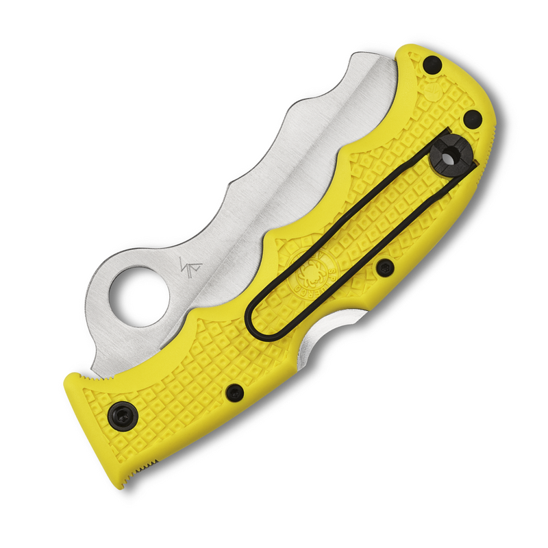 The Assist Salt combines the multi-functional versatility of the Assist model with the ultra-corrosion-resistant qualities of H-2 steel to set a new standard in rescue tools. The defining feature of the Assist Salt is its H-2 steel blade and lock bar. This unique material uses nitrogen instead of carbon to create a steel that is tough, holds an impressive edge, and is practically immune to corrosion. The blade’s Trademark Round Hole ensures swift, positive, one-handed opening, even while wearing heavy gloves. Its blunt tip safely slides under seat belts, clothing, and other materials and will not puncture flotation gear, while its SpyderEdge provides extreme cutting performance that easily powers through even the toughest materials. The Assist Salt’s bright yellow handle is injection molded from tough fiberglass-reinforced nylon and has both a Bi-Directional Texture pattern and finger grooves to guarantee a secure grip. The finger grooves also provide a solid purchase that enables the blade to “scissor cut” rope much like a cigar cutter. Squeeze the Assist Salt’s closed blade and a retractable carbide glass breaker extends from the butt end of the handle to safely and efficiently break windows. A built-in survival whistle, sturdy back lock mechanism, and a reversible wire pocket clip round out the knife’s features and ensure convenient carry and completely ambidextrous operation.