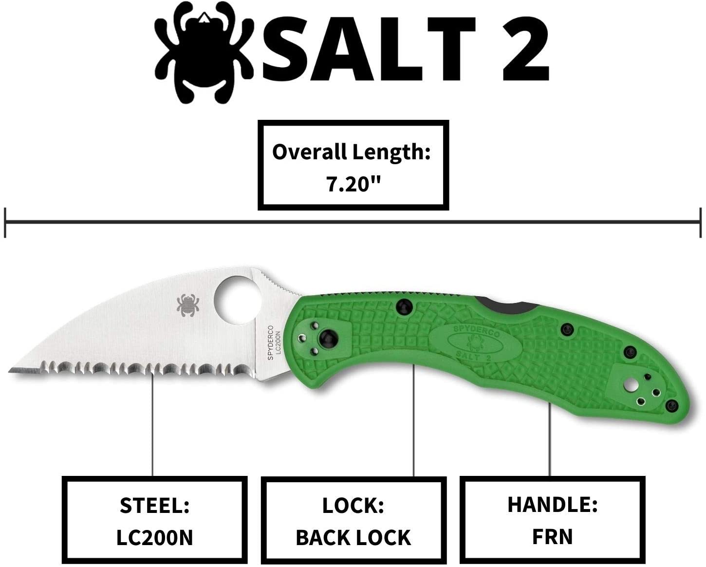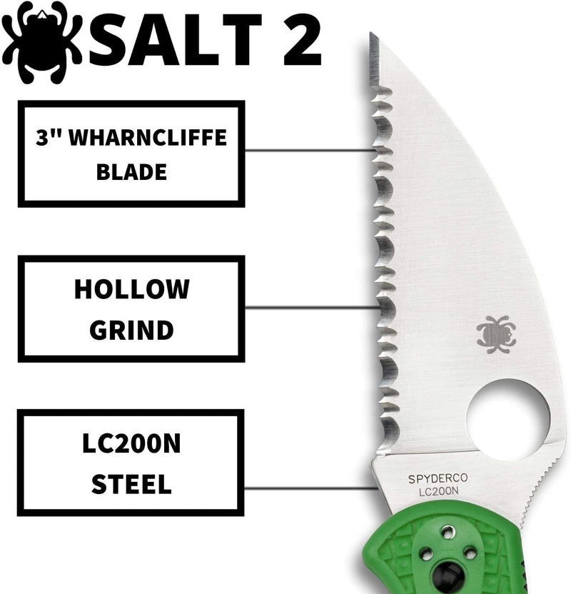 Spyderco Salt 2 Green LC200N Wharncliffe 3" Spyder Edge Folding Pocket Knife (C88FSWCGR2) Specifications:
