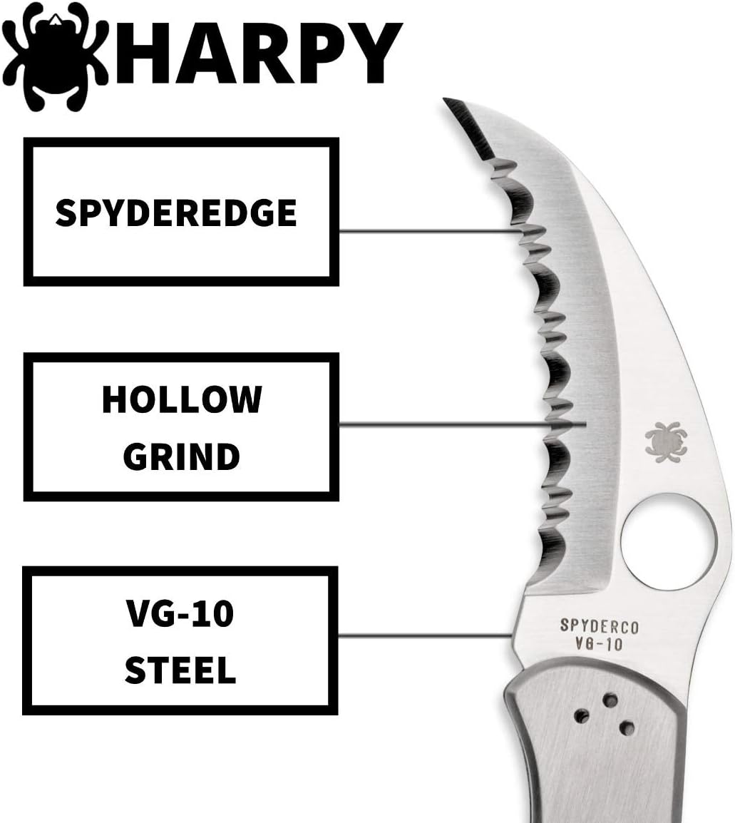 Like an animal’s claw, hawkbill blades pierce with the point and draw the material being cut into the natural curve of the edge. The impressive mechanics of this cutting action are even more potent when amplified by a serrated edge. The Spyderco Harpy was the first knife to integrate the dynamics of the hawkbill blade profile with the voracious cutting power of our fully serrated SpyderEdge. Its hollow-ground VG-10 stainless steel blade cuts with an authority far beyond its size and makes it the tool of choice for cutting netting, rope, cord, and webbing. Its Trademark Round Hole allows quick, positive, one-handed opening with either hand and proudly proclaims its Spyderco pedigree. Capable of right or left-side tip-up or tip-down carry, the Harpy features solid stainless steel handle construction, a sturdy back lock mechanism, and a drying vent/shackle key.
