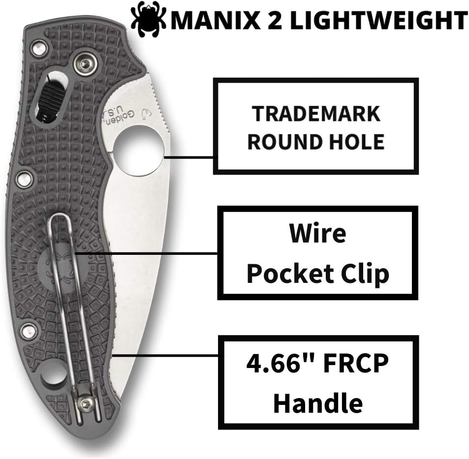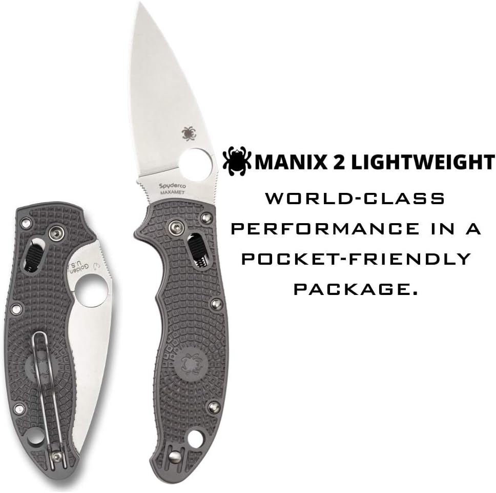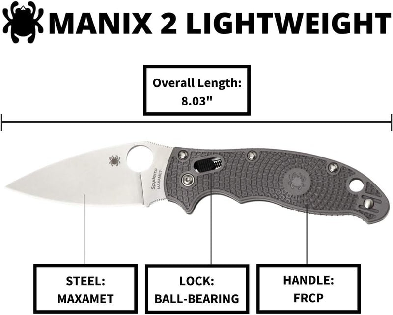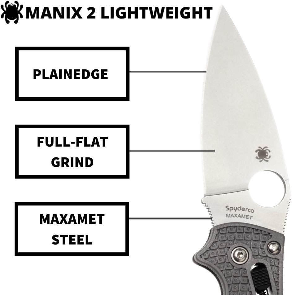 Spyderco Manix 2 Lightweight FRCP Gray Maxamet 3.37" Plain Edge Folding Pocket Knife (C101PGY2) Specifications: