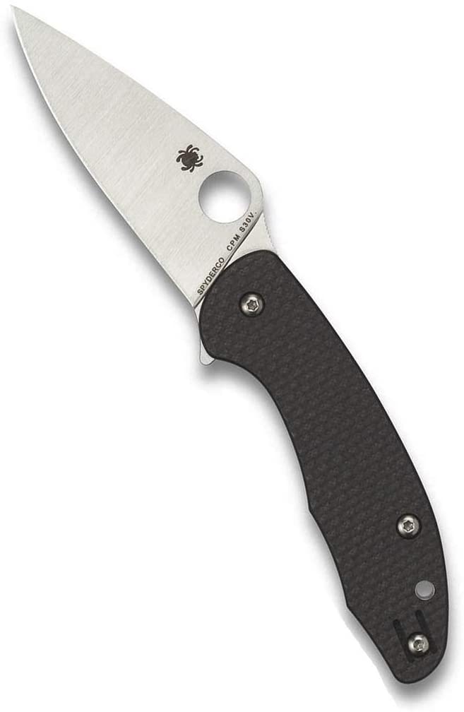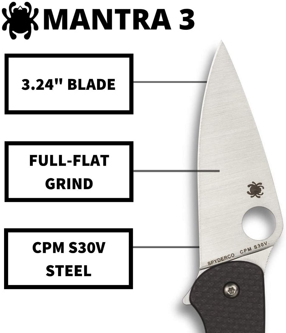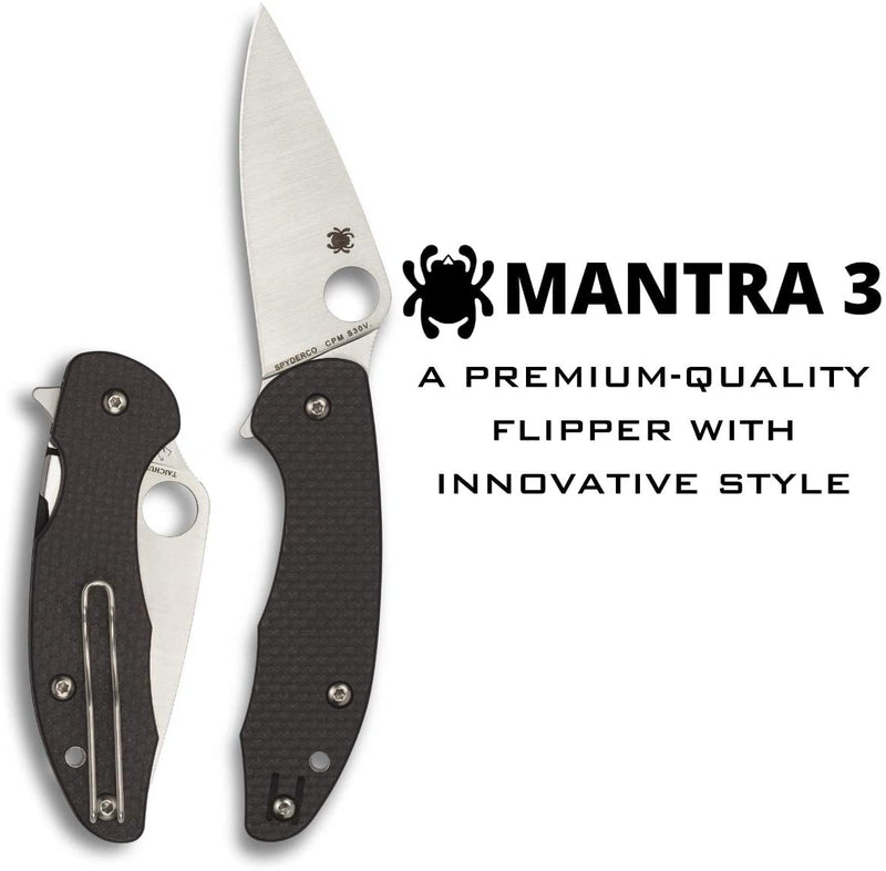 View moreThe Mantra 3 takes the proven style and functionality of Spyderco’s original Mantra design and expresses it in a practical, everyday carry format that combines a flipper-style opener with Spyderco’s patented Compression Lock. The heart of the Mantra 3 design is its full-flat-ground, leaf-shaped blade, which is precision machined from CPM S30V particle metallurgy stainless steel. Engineered to open equally well with either its index-finger flipper or its fully accessible Round Hole, the knife’s opening action is further enhanced by specially designed ball-bearing washers between the blade and the handle’s stout stainless steel liners. In addition to providing structural strength for the handle, the liners also form the foundation of the Mantra 3’s high-strength Compression Lock mechanism. They are nested within handsome carbon fiber/G-10 laminate scales that have a subtle texture to ensure a positive grip.