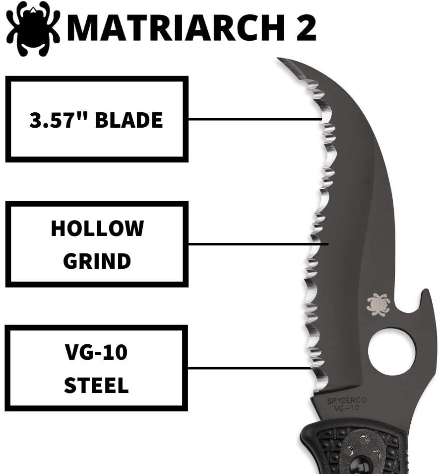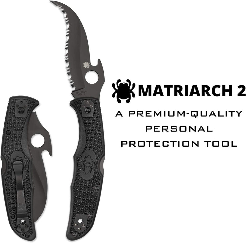 View moreThe culmination of years of evolution and refinement, the Spyderco Matriarch 2 with Emerson Opener and Black Blade. It traces its lineage back to the revolutionary Civilian folding knife, which was specifically developed as a survival tool for undercover narcotics officers. The Civilian’s distinctive Reverse “S” blade was later integrated with an injection-molded fiberglass-reinforced-nylon (FRN) handle to create the original Matriarch. The Matriarch 2 combines a VG-10 stainless steel Reverse “S” blade with the lightweight handle of Spyderco’s best-selling Endura 4. Ernest Emerson’s patented Emerson Opening feature supercharges the design with an integral hook on the back of the blade that opens it when the knife is drawn from the pocket. Adding a stealthy black titanium carbonitride (TiCN) coating to the blade and other metal hardware eliminates reflection and makes this knife ideal.