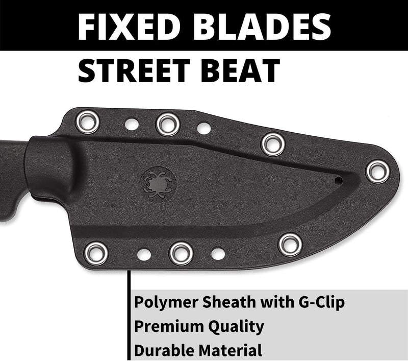 View moreThe Street Beat Lightweight combines Fred Perrin’s acclaimed Street Beat design with the manufacturing efficiencies of an injection-molded handle and sheath. The result is an exceptionally functional, extremely affordable fixed-blade knife. The Street Beat Lightweight’s Bowie-styled blade is machined from VG-10 stainless steel and features a full-flat grind for superior balance of edge geometry and strength. The blade also features a non-reflective black ceramic coating. Its fiberglass-reinforced-nylon handle is injection molded directly onto the blade’s concealed tang and features the same ergonomic contours as the original. Perrin’s signature index-finger choil provides a streamlined but extremely effective guard to prevent the user’s hand from slipping during use. A section of jimping (textured grooves) on the blade and handle spine provides a high-traction thumb index and ensures superior control during precise cutting tasks. For users who prefer lanyards on their knives, the handle also includes a generously sized lanyard hole. To maximize its carry options, the Street Beat Lightweight comes with an injection-molded, snap-fit polymer sheath with a G-Clip attachment. The G-Clip can be attached to either side of the sheath for ambidextrous use and is angle adjustable to support a full spectrum of vertical, horizontal, or canted carry on the belt or inside the waistband.