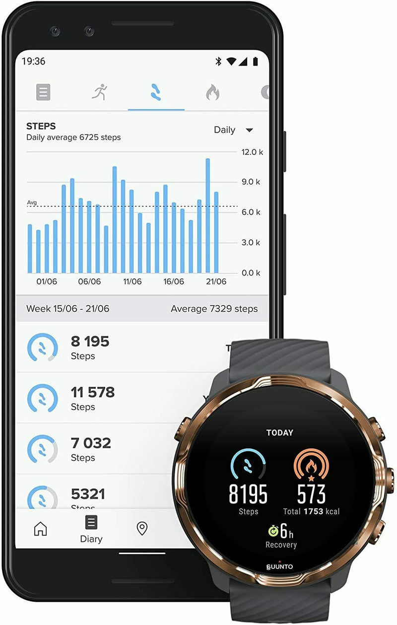 All the sports features of Suunto 7 are just one button press away. Track your exercise accurately with 70+ sports modes, GPS and wrist heart rate sensor. Quickly check your daily steps and calories on the watch. You can also connect your headset to your phone and control music from your wrist.