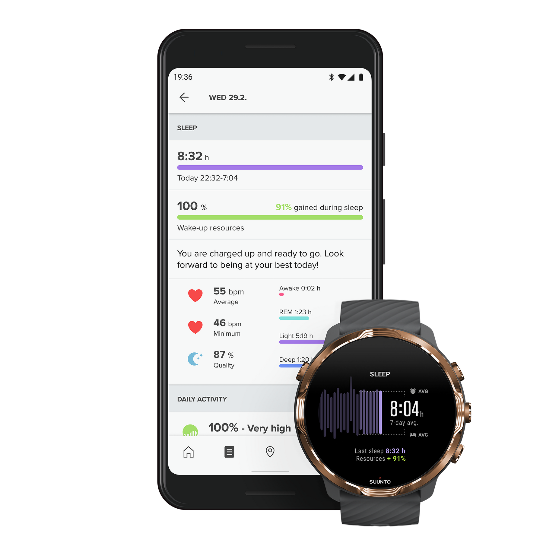 All the sports features of Suunto 7 are just one button press away. Track your exercise accurately with 70+ sports modes, GPS and wrist heart rate sensor. Quickly check your daily steps and calories on the watch. You can also connect your headset to your phone and control music from your wrist.