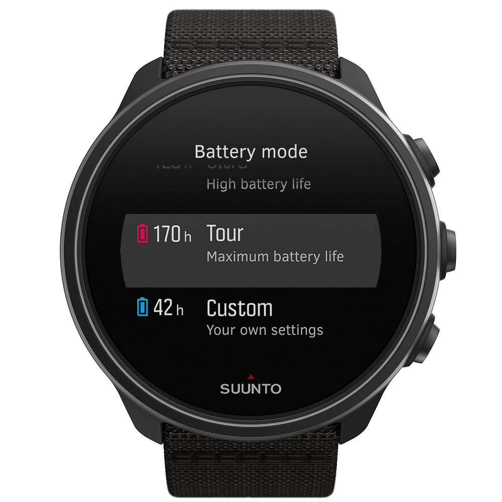 Four predefined battery modes – Performance, Endurance, Ultra and Tour – deliver from 25 hours to up to 170 hours* of recording time with GPS tracking on. When you start a recording, you’ll get an estimate of how much battery you have left with the current mode. If it’s not enough, switch to another mode at any time. Suunto 9 uses smart reminders based on your activity history, to help ensure you are fully charged for your next outing. If the watch notices you are running low on battery during an exercise, it will automatically suggest changing to a different battery mode.