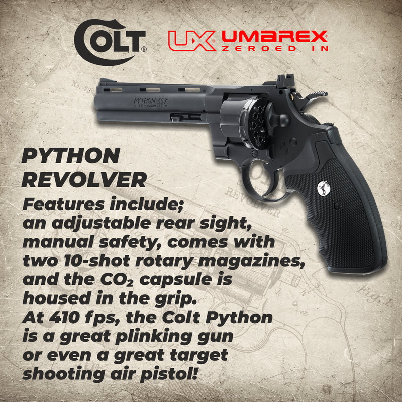 This CO2 BB revolver Air Pistol has a 6.875" barrel and textured grips with the Colt logo. This airgun is great to maintain air pistol proficiency without the cost or inconvenience of going to a range. Features include; an adjustable rear sight, manual safety, comes with two 10-shot rotary magazines, and the CO2 capsule is housed in the grip. At 410 fps, the Colt Python is a great plinking or target shooting air pistol!