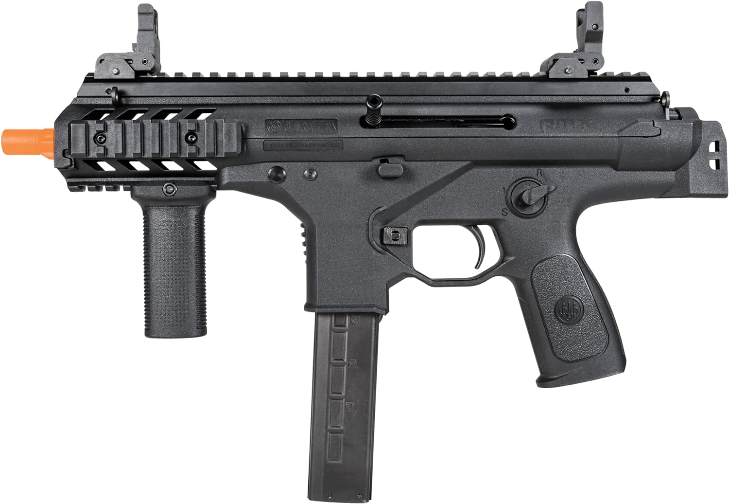 Beretta's hot new PMX is now available as a 6mm GBB airsoft gun. With reliable green gas power, the Beretta PMX sends .20 gram BBs downrange at 345 FPS and has a 1,100 round-per-minute cyclic rate. Plenty of Picatinny rail is available on the top rail, sides, and bottom for the airsoft accessories and optics of your choosing. The drop-free PMX magazine holds 48 airsoft BBs and has a locking follower making it easy to load the mag, and flip-up iron sights are fitted to the top rail. There are no batteries or chargers to buy for this airsoft rifle. Just pick up a can of Elite Force Green Gas (not included) and a bottle of Bio BBs and you'll be ready to hit the airsoft fields. The main body is made of tough, reinforced, fiberglass polymer that keeps the total weight low. It has a crisp blowback and recoil. The included flip-up sights are removable. To hone in your accuracy this rifle has an adjustable hop-up. Lastly, it has built-in sling attachment points for easy field carry and deployment.