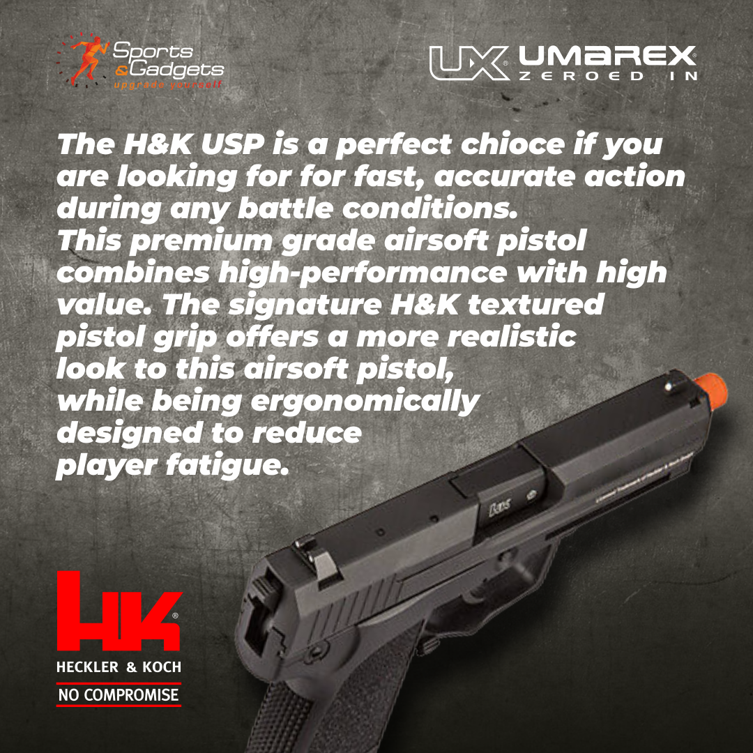 The H&K USP is a perfect chioce if you are looking for for fast, accurate action during any battle conditions. This premium grade airsoft pistol combines high-performance with high value. The signature H&K textured pistol grip offers a more realistic look to this airsoft pistol, while being ergonomically designed to reduce player fatigue. The semi-auto design allows you to fire as fast as you can pull the trigger, with no delay or having to manually cock back the hammer between each shot. Utilize the adjustable hop-up for various target range and wind conditions, to achieve maximum precision.