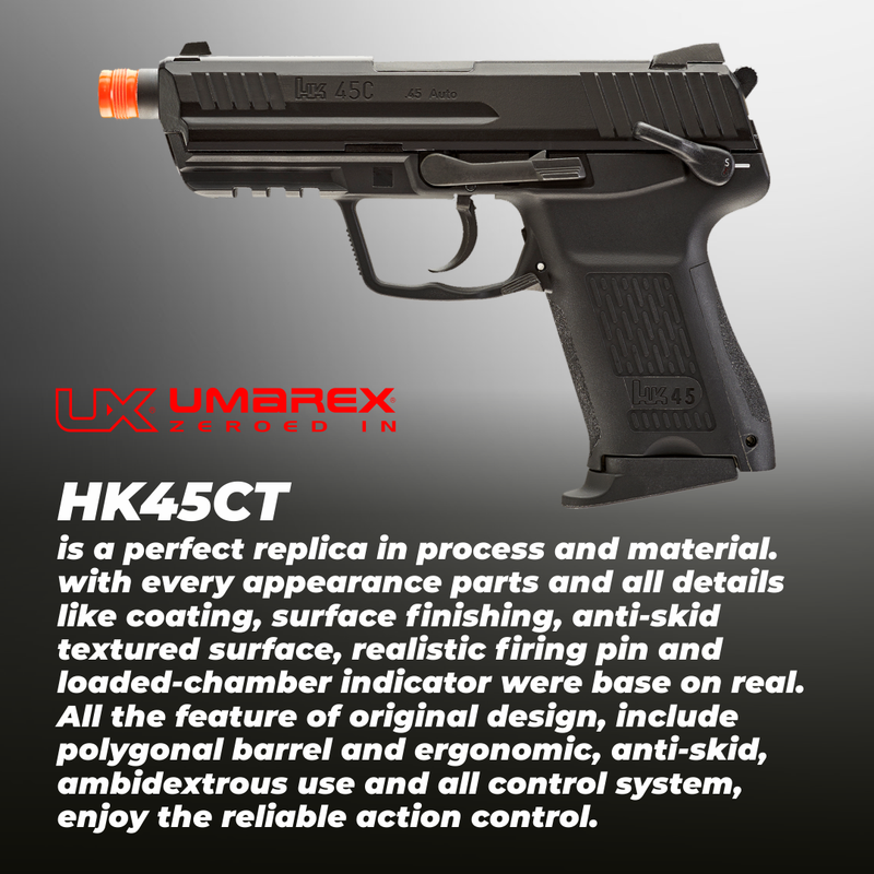 HK45CT is a perfect replica in process and material. with every appearance parts and all details like coating, surface finishing, anti-skid textured surface, realistic firing pin and loaded-chamber indicator were base on real. All the feature of original design, include polygonal barrel and ergonomic, anti-skid, ambidextrous use and all control system, enjoy the reliable action control. Metal slide with grip serrations and realistic coating, nylon-reinforced polymer body with picatinny rail and the extended threaded barrel for suppressors. By a new designed gas pistol hop-up quick adjusting set, an included screwdriver can direct adjusting the hop-up from the recoil spring sleeve in front of gun and You don't have to disassemble anymore.