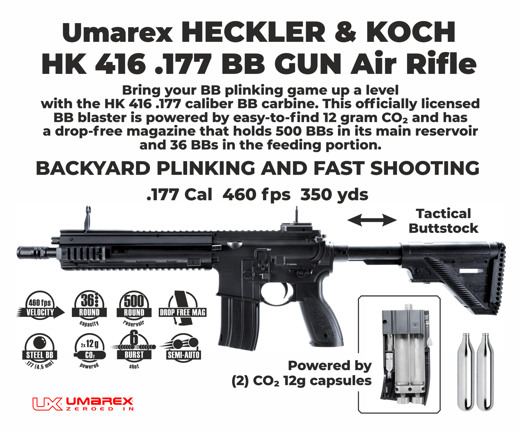 Bring your plinking game up a level with the HK 416 .177 caliber Air Rifle. This Air Rifle is powered by easy-to-find 12 gram CO2 (CO2 NOT included) and has a drop-free magazine that holds 500 BBs in its main reservoir and 36 BBs in the feeding portion. Reloads are fast and CO2 changes are very easy with this system. The HK 416 Air Rifle is loaded with plenty of Picatinny Rails for the attachment of optics and accessories. The HK Heckler & Koch HK416 .177 Caliber CO2 Air Rifle is sure to give fans of target hours of backyard shooting fun for years to come. This is the perfect Air Rifle for you. Great for a present!