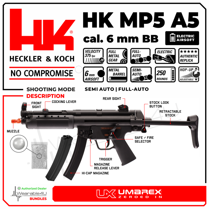 - IN THE BOX: 1 x Umarex HK Heckler & Koch MP5 A5 Rifle Airsoft Gun, 1 x Pack of 1000 6mm BBs