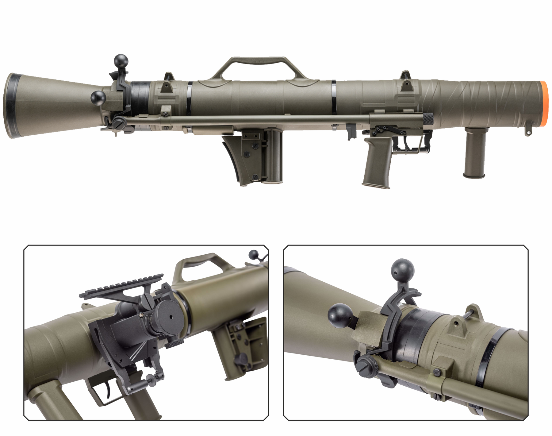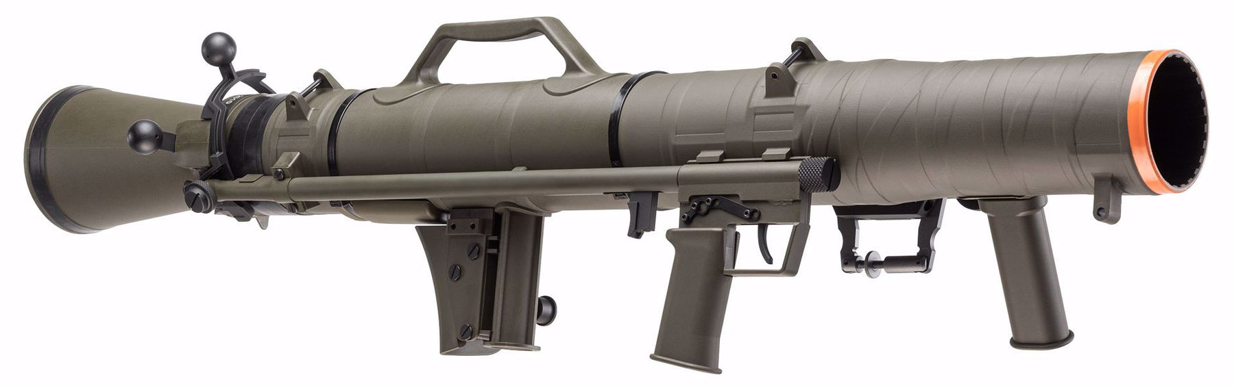 Go big or go home with the Elite Force M3 CARL GUSTAF MAAWS airsoft launcher. This big stick launches a 65mm shell that is filled with 6mm airsoft BBs. The shell separate in flight releasing a swarm of airsoft BBs. The BB ball launches at 115 FPS and is powered by green gas which is loaded into a 40mm shell behind the 65mm BB shell. Use the included flip-up iron sights or install an optic on the detachable picatinny rail.