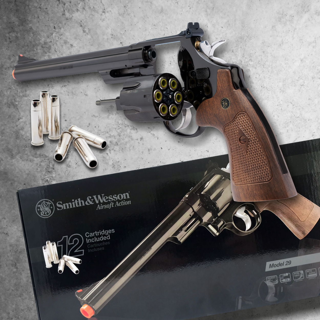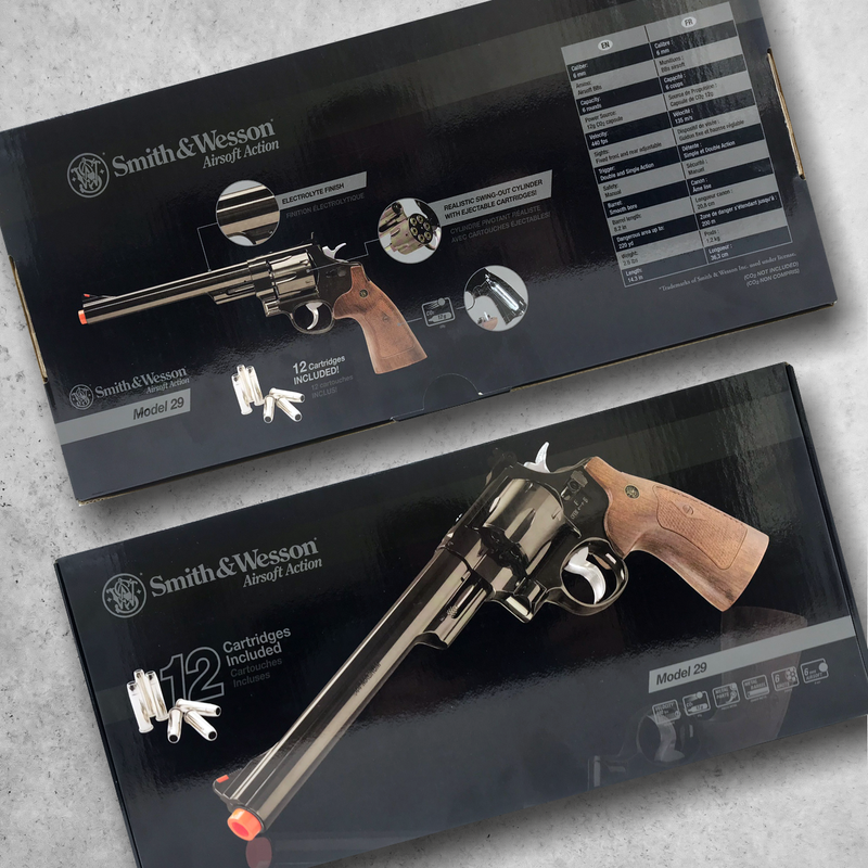 First impressions matter. This Airsoft Pistol uses cartridges that hold a 6mm airsoft BBs. This big barrel does create plenty of power. Expect .20 gram BBs to fly around 440 FPS. Get your own Smith & Wesson Model 29 Airsoft pistol. This airsoft pistol includes (12) Elite Force standard shell cases to keep your Smith & Wesson running for the match. The M29 Airsoft Pistol is powered by a single 12-gram CO2 cartridge and is housed in the full-size grip.