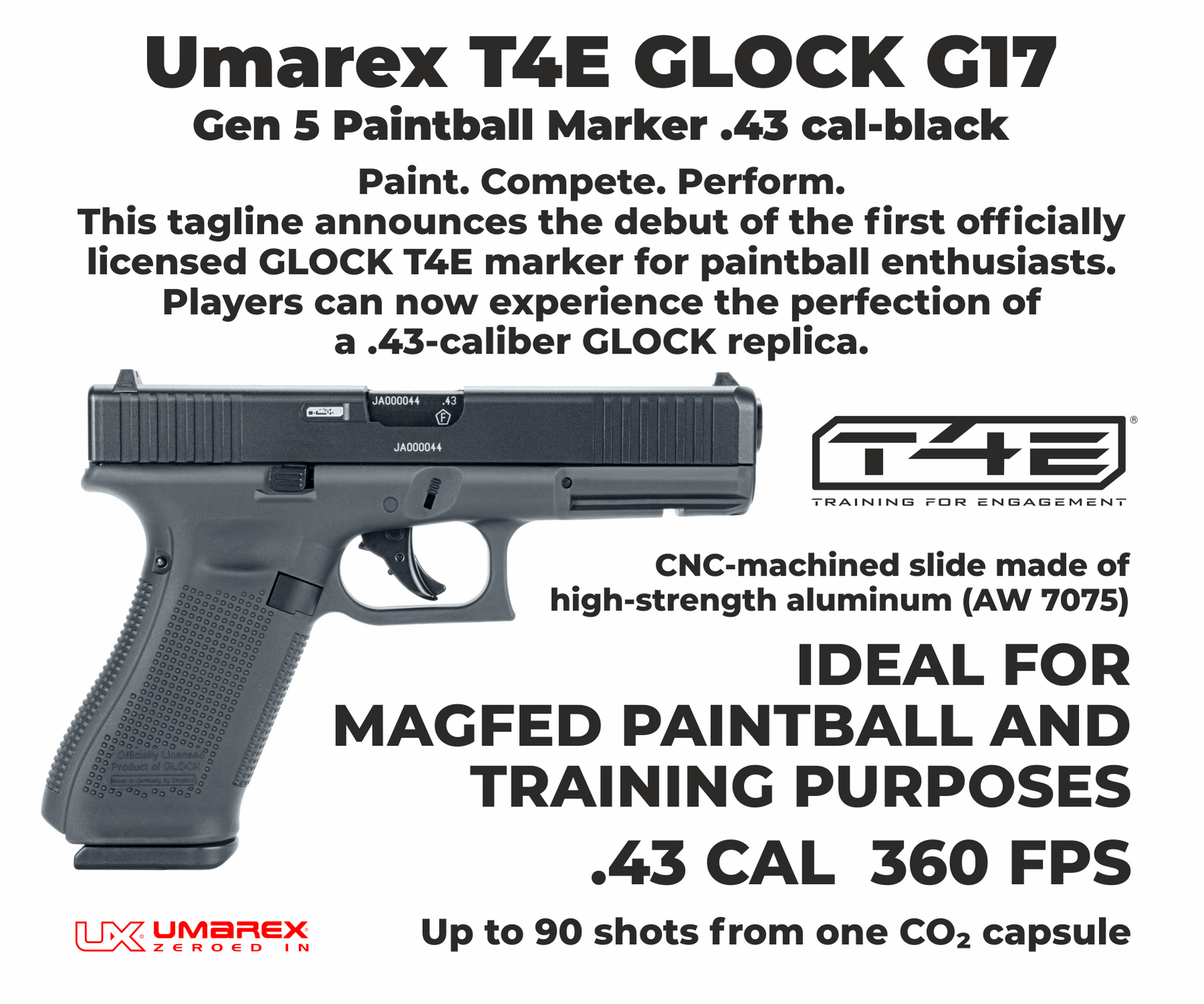 The Umarex T4E Glock G17 Gen 5 .43 Cal Paintball Marker delivers authentic Glock ergonomics with reliable CO₂-powered performance. Manufactured in Germany from high-quality materials, this semi-automatic blowback marker is built for realistic training, target practice, and scenario-based use.