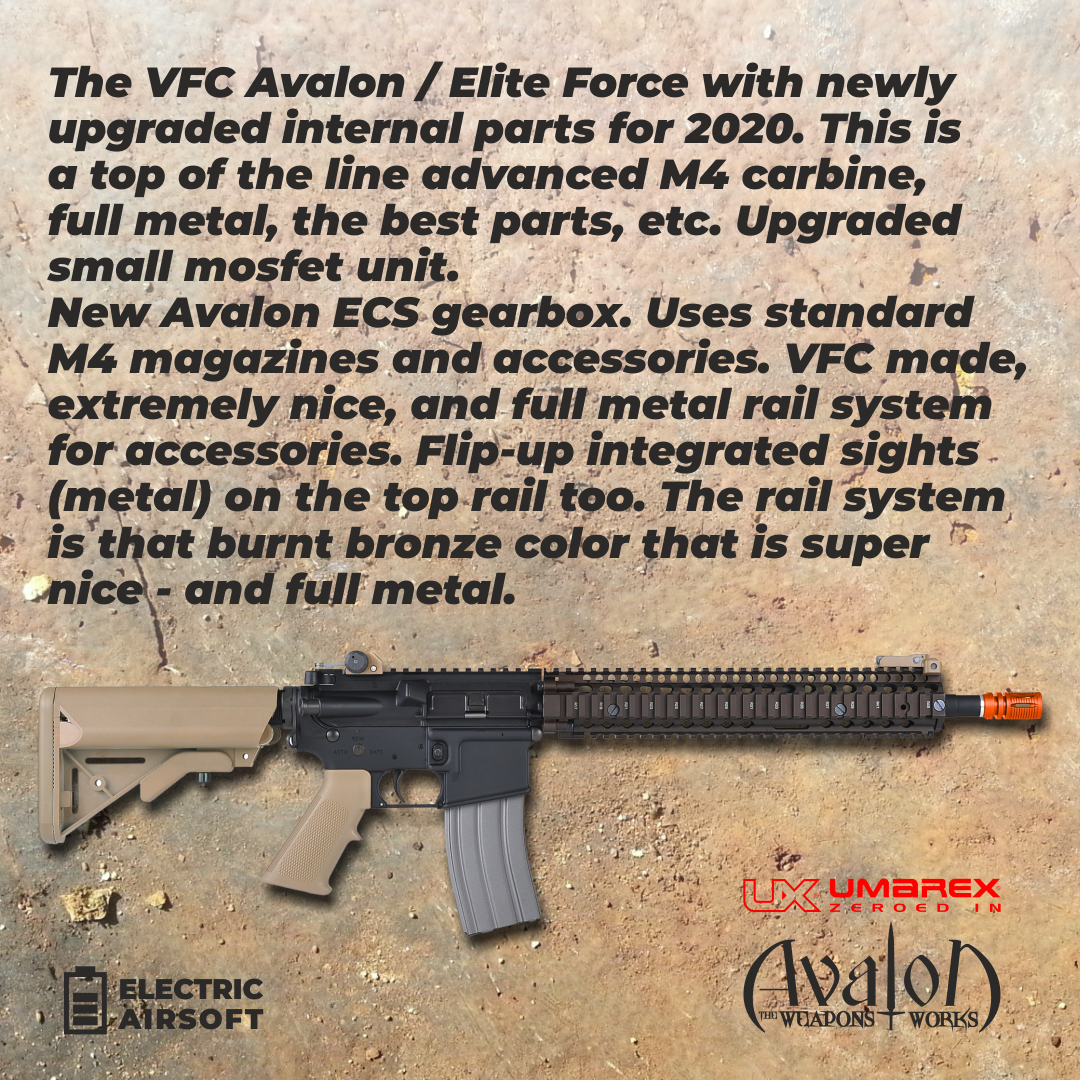 The VFC Avalon Block II AEG Airsoft Rifle delivers top of the line performance and irrestible appeal. The Block II notably features an officially licensed Daniel Defense front quad rail that is equipped with a flip up front sight. The rear furniture is tan in color and the stock is six-position adjustable. The full-metal upper and lower are finished in matte black. The Block II is fitted with an upgraded mosfet unit and the tough Avalon ECS gearbox. This AEG is powered be an 11.1v LiPo battery (not included) and can accept most standard magazines. The Elite Force Avalon VFC Block II launches .20 gram BBs at 320 FPS.