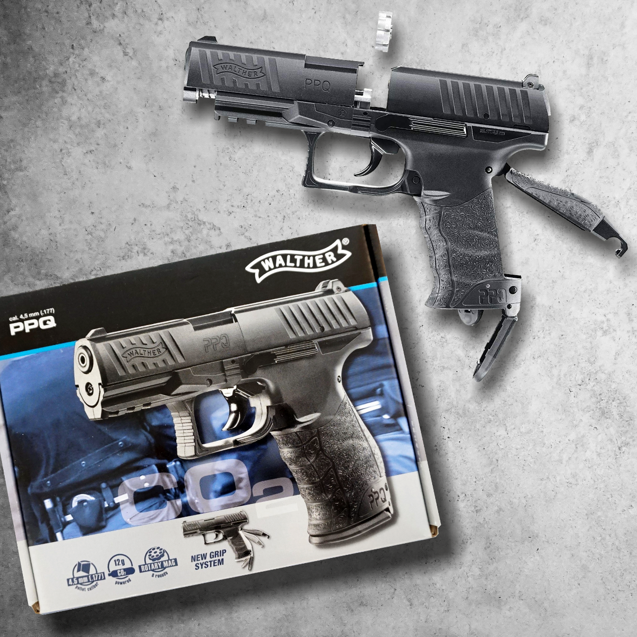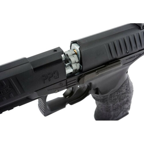 The PPQ Air Pistol powered by one 12g CO2 cylinder that hides in the grip of the BB pistol. An integrated accessory rail underneath the muzzle is a great place to add a flashlight or an airgun laser. The Walther PPQ CO2 Air pistol has a manual slide lever safety, single action trigger, and a fixed blade front sight and an adjustable rear sight. This Air pistol is not only a great for some fun plinking, but also makes a great target shooting and training.