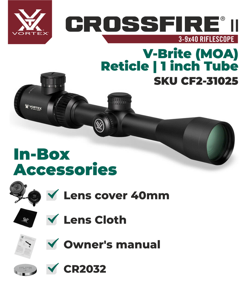 In The Box Vortex Optics Crossfire II 3-9x40 SFP Riflescope V-Brite Illuminated MOA with Wearable4U Bundle (May Vary)
