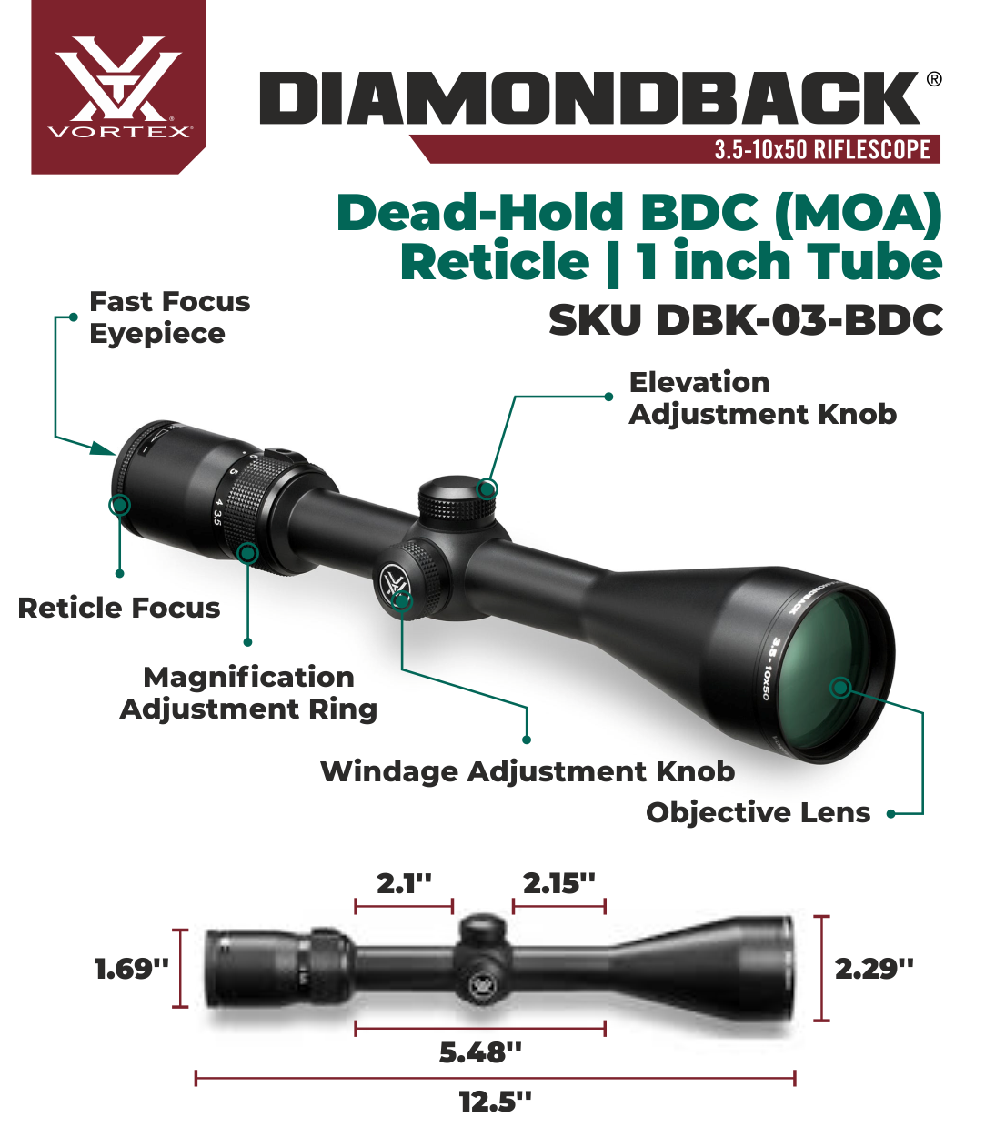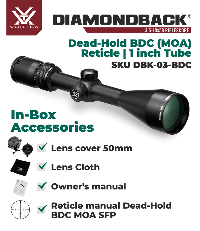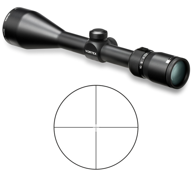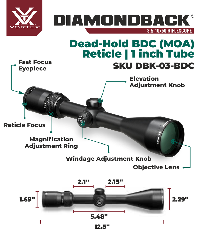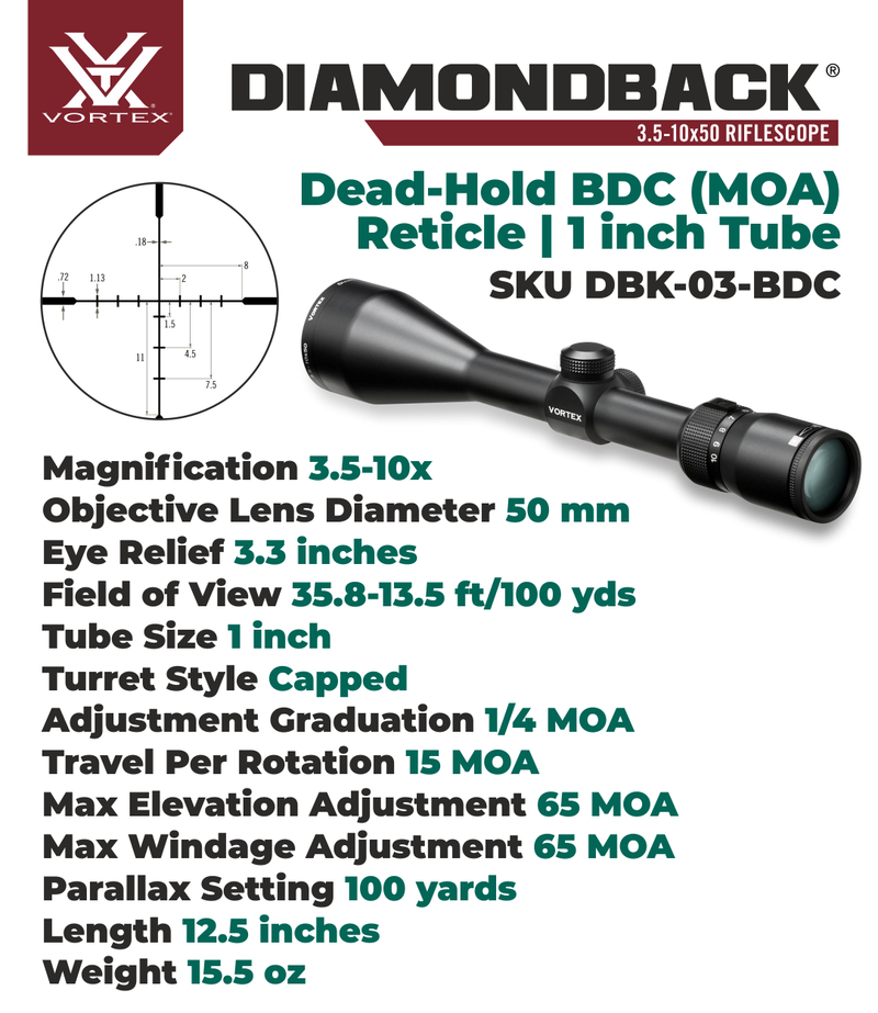 The Diamondback - loaded with features! First, the solid one-piece aircraft-grade aluminum alloy construction makes the Diamondback riflescope virtually indestructible and highly resistant to magnum recoil. Argon purging puts waterproof and fogproof performance on the agenda, and advanced fully multi-coated optics raise an eyebrow when crystal clear, tack-sharp images appear in the crosshairs. Look for all this and more in a riflescope you'd expect to cost quite a bit more-but doesn't. We can live with that.