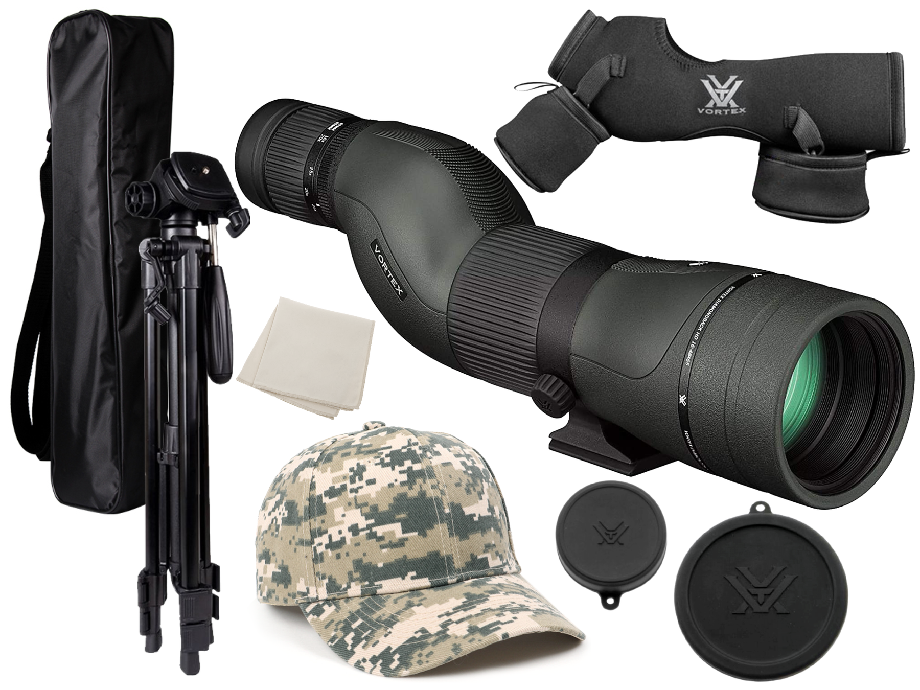 "name": "Vortex Optics Diamondback HD Spotting Scope 16-48x65 Straight with Free TriPod and Hat Bundle",