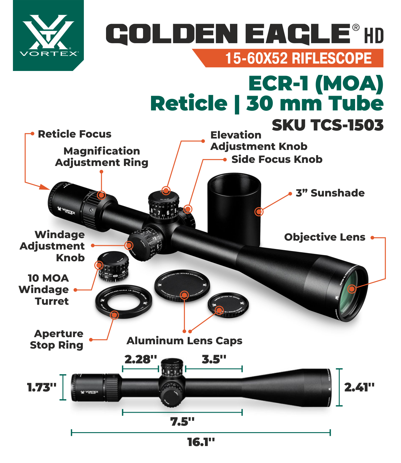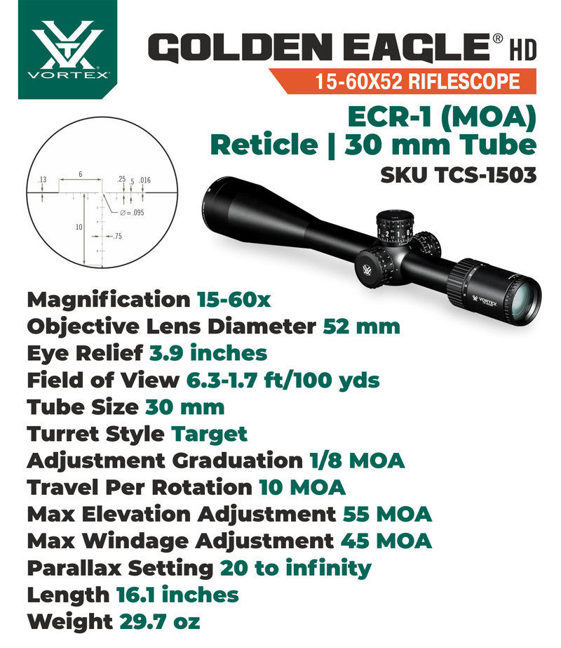 Vortex Optics Golden Eagle HD 15-60x52 ECR-1 MOA SFP Riflescope Specifications: