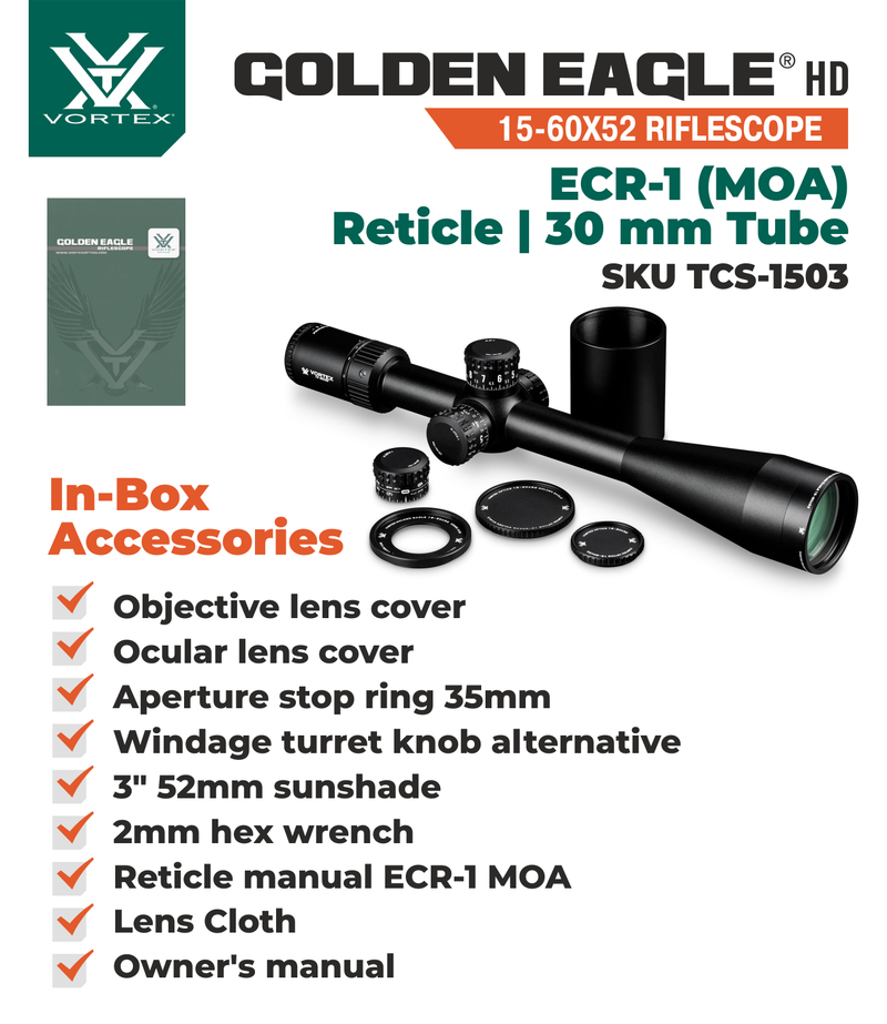 In The Box: Vortex Optics Golden Eagle HD 15-60x52 ECR-1 MOA SFP Riflescope with Wearable4U Bundle (May Vary. Choose Your Variation).