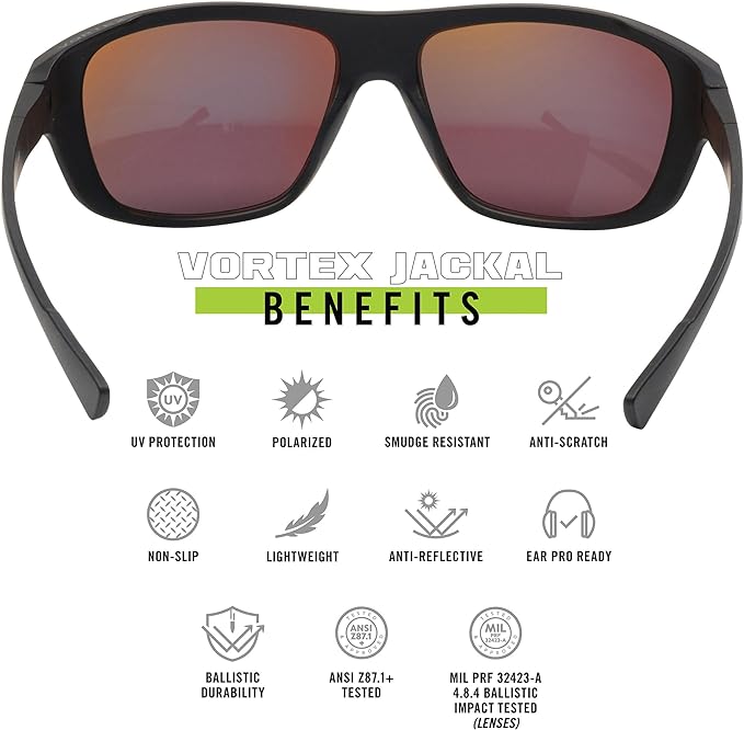 Protects your eyes when life’s coming in hot. Jackal performance sunglasses bridge the gap between hyper-tactical eyewear and uncomfortable safety glasses, delivering UV and ballistic-rated protection, comfort, versatility, and casual style all backed by the lifetime Vortex VIP Warranty.