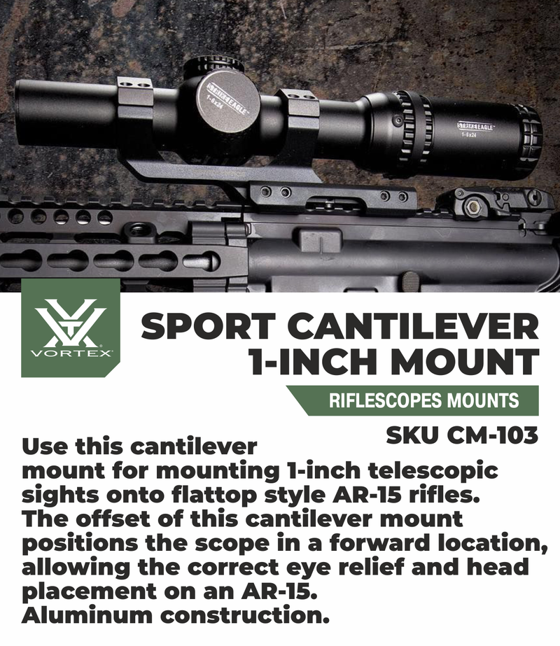 Use this cantilever mount for mounting 1-inch telescopic sights onto flattop style. The offset of this cantilever mount positions the scope in a forward location, allowing the correct eye relief and head placement. Aluminum construction.