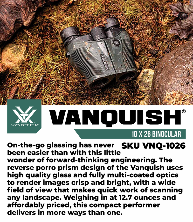 On-the-go glassing has never been easier than with this little wonder of forward-thinking engineering. The reverse porro prism design of the Vanquish uses high quality glass and fully multi-coated optics to render images crisp and bright, with a wide field of view that makes quick work of scanning any landscape. Weighing in at 12.7 ounces and affordably priced, this compact performer delivers in more ways than one.