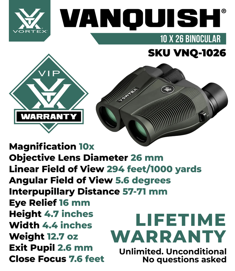 Vortex Optics Vanquish 10x26 Reverse Porro Prism Binocular (VNQ-1026) Specifications:
