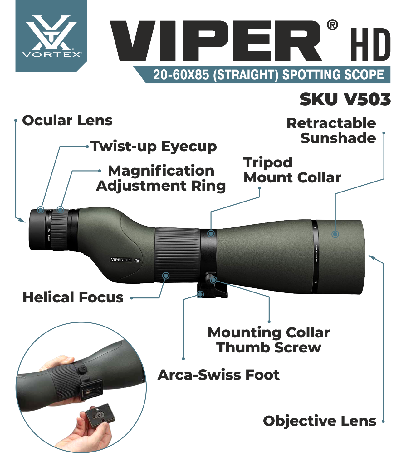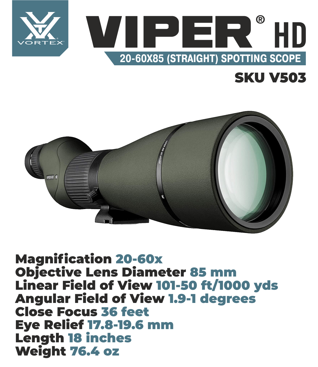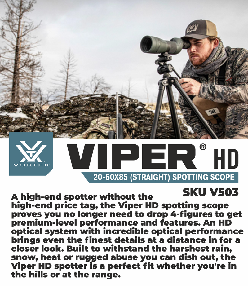 An HD optical system with incredible optical performance brings even the finest details at a distance in for a closer look. Built to withstand the harshest rain, snow, heat or rugged abuse you can dish out, the Viper HD spotter is a perfect fit whether you're in the hills or at the range.