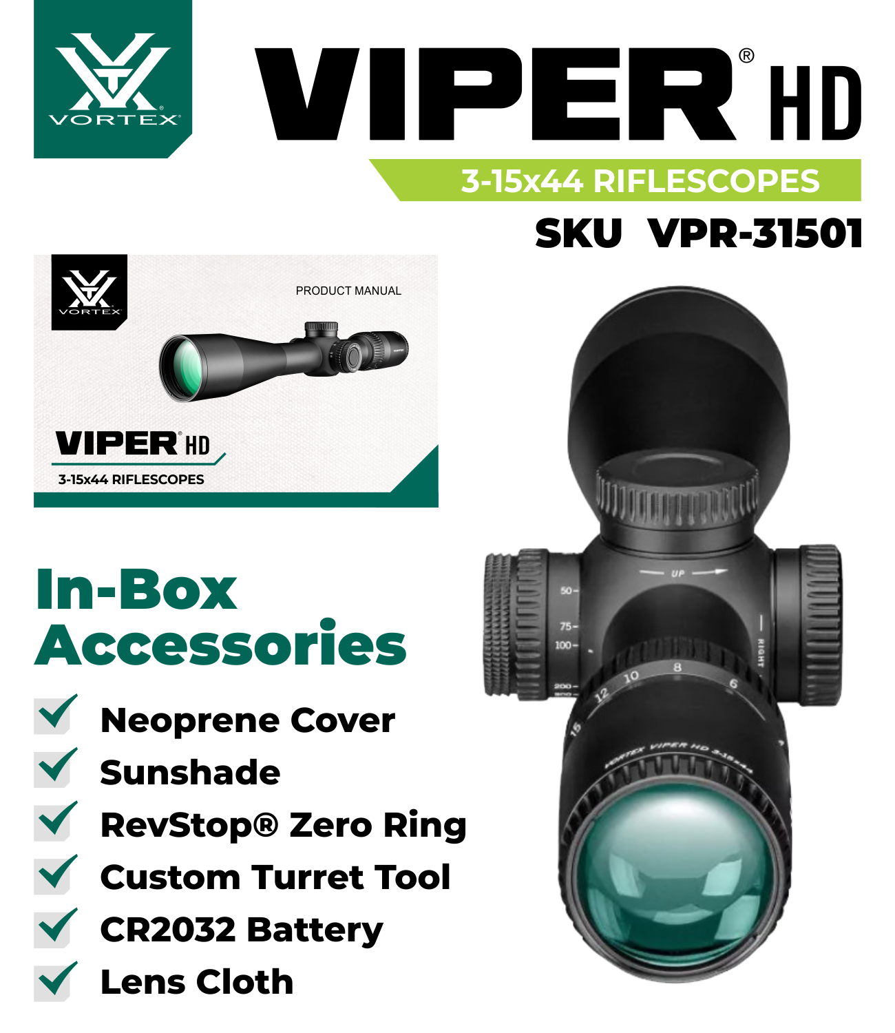 In The Box Vortex Optics Viper HD 3-15x44 SFP Dead-Hold BDC MOA Riflescope (VPR-31501) (Bundle Options Available. Choose Your Bundle Option):