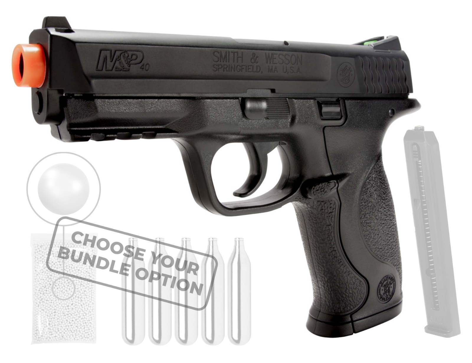 Pick up the Umarex Smith & Wesson M&P 40 Airsoft Pistol for some good old fashioned affordable Airsoft plinking fun. This Airsoft Pistol uses the standard replacement magazine. This Airsoft pistol is powered by cheap, reliable 12 gram non-threaded CO2 and shoots BBs at 300 FPS. This is the perfect Airsoft Pistol for you. Great for a present! No hustle searching for compatible accessories! Buy the bundle and enjoy!